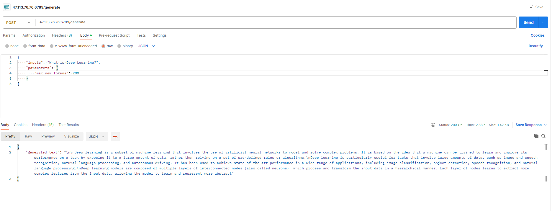 -d '{"inputs":"What is Deep Learning?","parameters":{"max_new_tokens":200}}' \