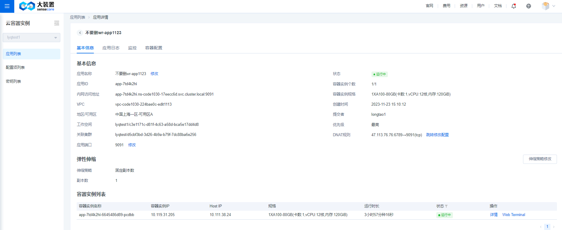 - 登录容器:通过应用详情页面对容器实例列表中的实例可以直接进行Web Terminal登录到指定容器。