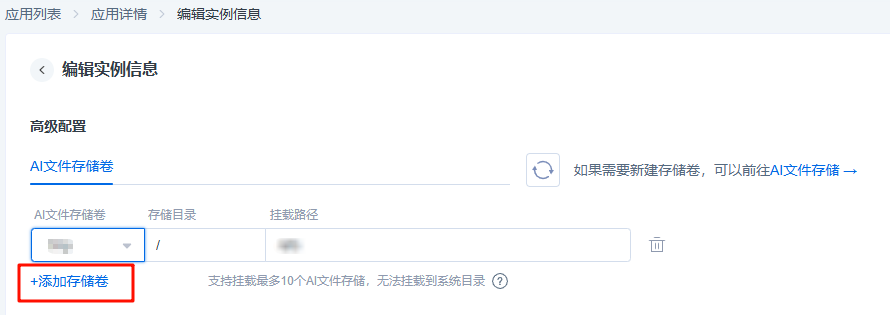 其中,挂载AI文件存储支持最多挂载10个存储卷,可指定一级目录,默认为“/”。如果没有可用的存储卷,可以跳转到AI文件存储产品创建存储卷;