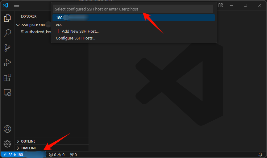- 在 VScode 客户端左下角点击启动 Remote - SSH,选择 conncet to host 可选择已添加的 host 或添加新的 host 进行连接。