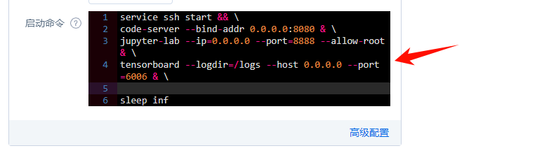 为在容器启动的同时开启SSH/Web VSCode/Jupyter Lab/Tensorboard 等服务,可设定容器启动命令如下: