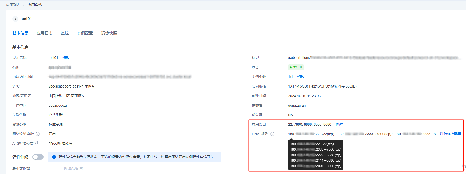 - 修改配置:通过应用的详情页和容器配置页面可以对创建好的应用进行配置修改,可通过DNAT规则配置为Internet访问容器服务开通端口。