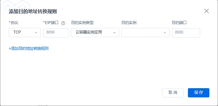 - 如果该推理服务需要通过外网访问,则需要通过详情页的DNAT规则进行绑定将服务对外暴露。点击详情页的【DNAT规则】,跳转到弹性公网EIP进行规则配置,添加目的地址转换规则的目的端口需要和创建应用的应用端口一致。