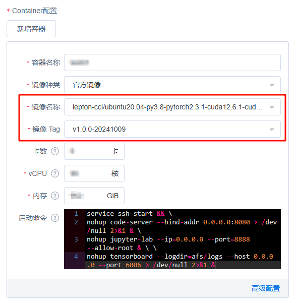 - 镜像种类包括官方镜像和私有镜像,官方镜像的镜像名称中会包含Ubuntu、pytorch以及cuda等版本信息,私有镜像您可以通过容器镜像服务CCR产品上传您的镜像并选择使用,镜像名称和镜像Tag根据需要下拉选择,卡数、vCPU、内存需要您输入为每个容器分配的对应资源量,要确保各容器分配的资源总量不得超过所选择的容器实例规格;