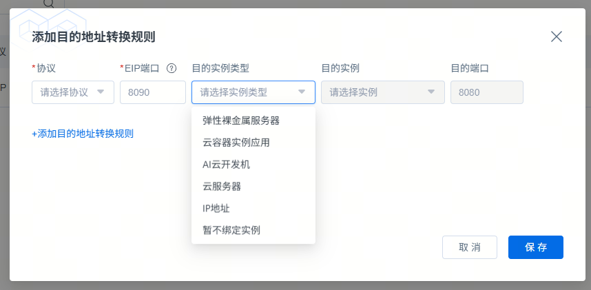 | 目的实例类型 | 按需选择提供真实服务的实例类型,包括弹性裸金属服务器、云容器实例应用、AI云开发机、云服务器、IP地址等 |