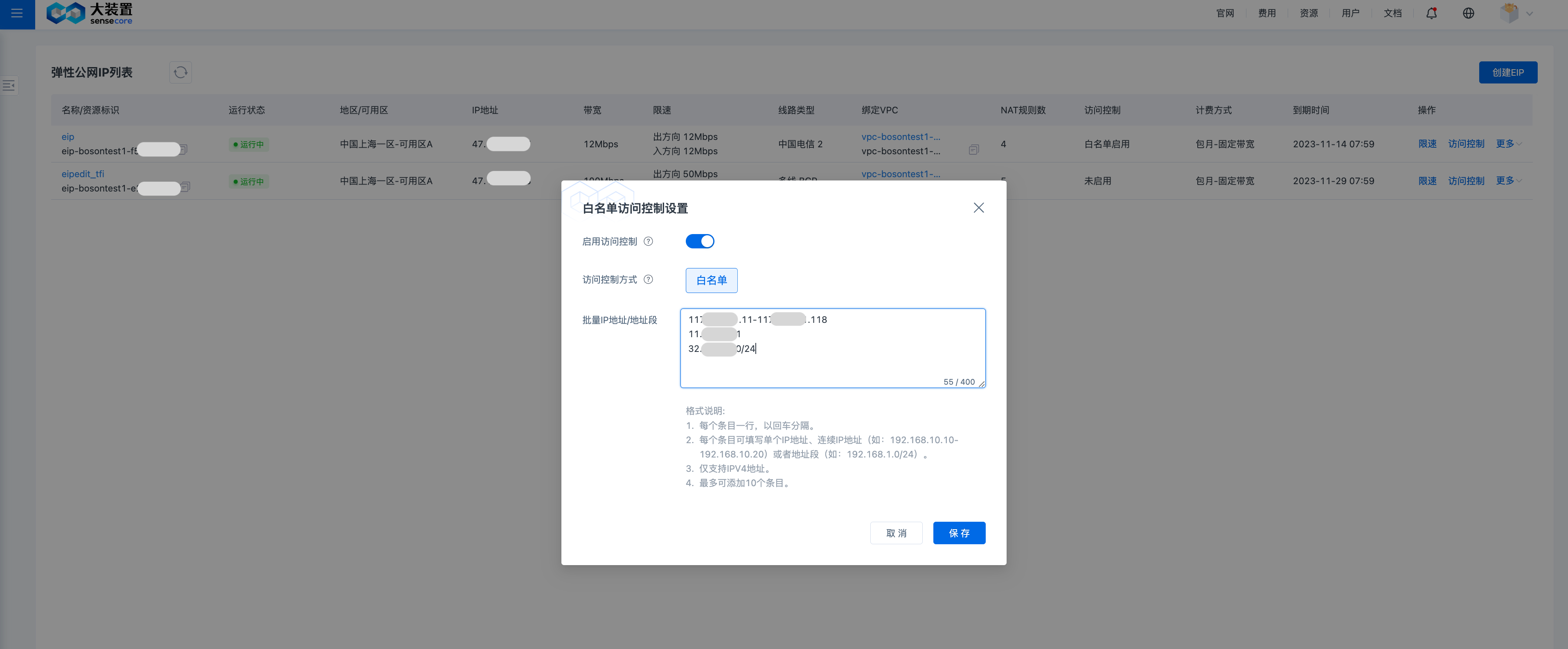 在开启入网白名单访问控制后,可以通过设置外网IP白名单,实现入网方向的访问控制。