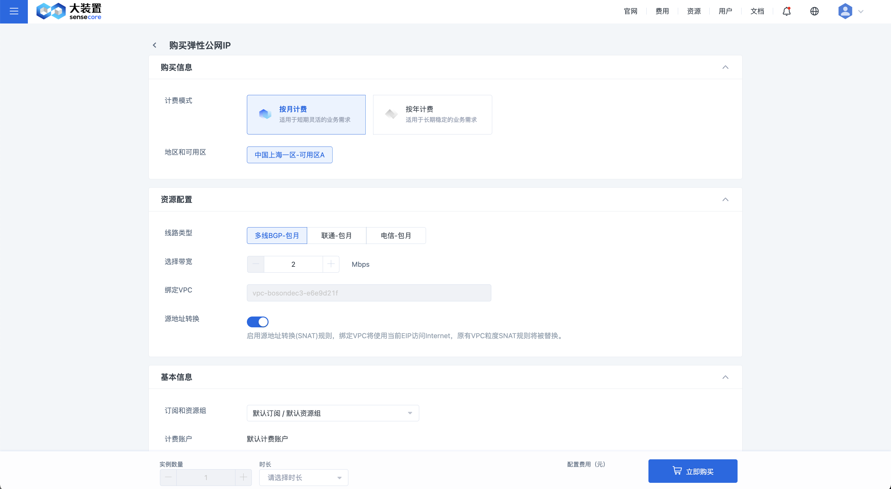 | 源地址转换 | 启用源地址转换,绑定VPC内资源主动访问公网将使用新创建的eip,需注意,如果原本已经有主EIP,如果不希望更新主eip,请关闭此开关。 |