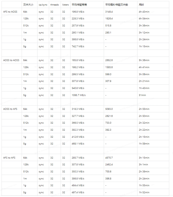 同可用区内,文件到对象、对象到对象、对象到文件、文件到文件场景的性能测试