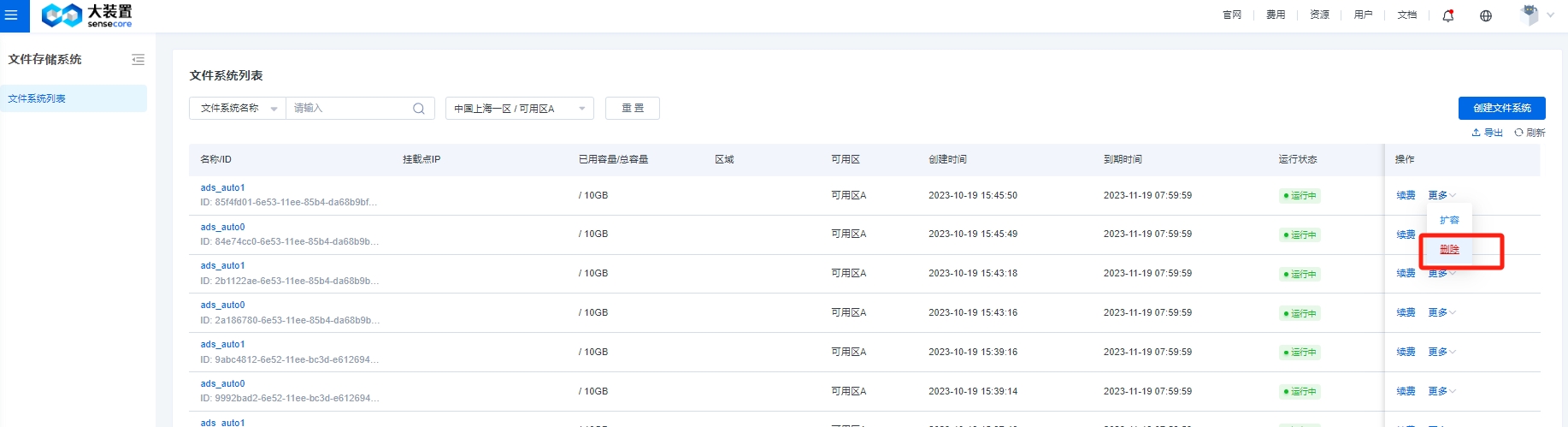 在文件系统列表,包含新建文件系统、及对文件系统进行管理的功能。