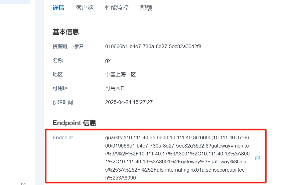详情分为文件系统详情、客户端和性能监控三个模块;可以通过详情页看到文件系统的基本信息、挂载点和计费信息;在客户端页展示计算节点的名称及IP信息及所在地区和可用区信息;在性能监控模块看到文件系统空间的IOPS、吞吐等性能展示。