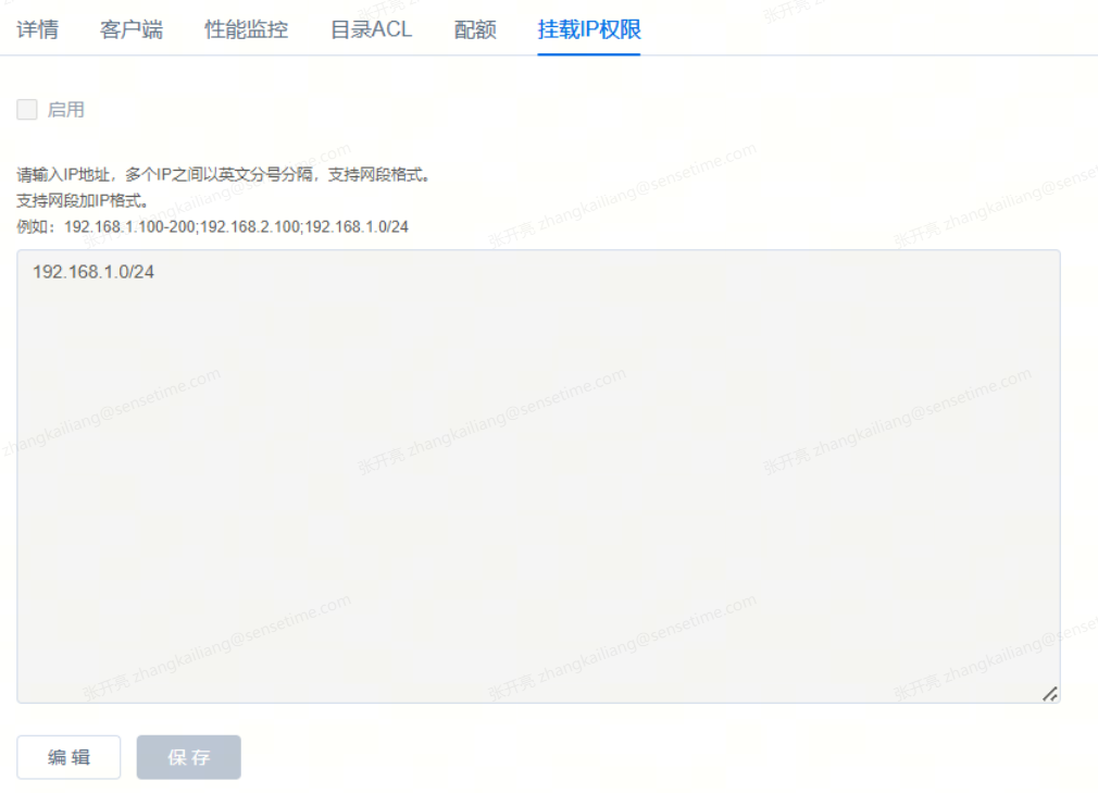 点击 编辑 按钮,解锁IP输入框后,点击复选框【启用】按钮,此时可以填写允许挂载的IP地址。