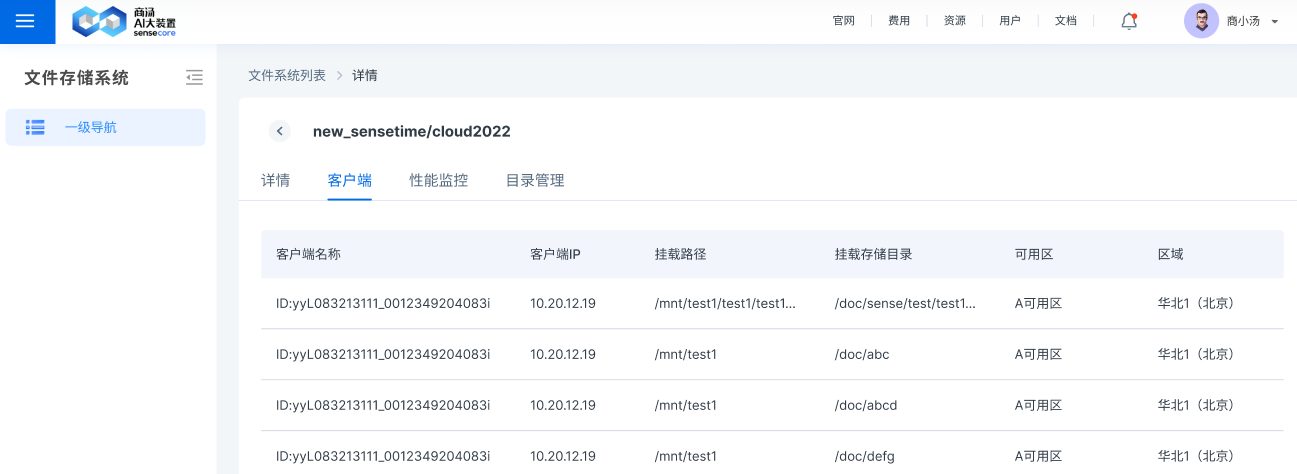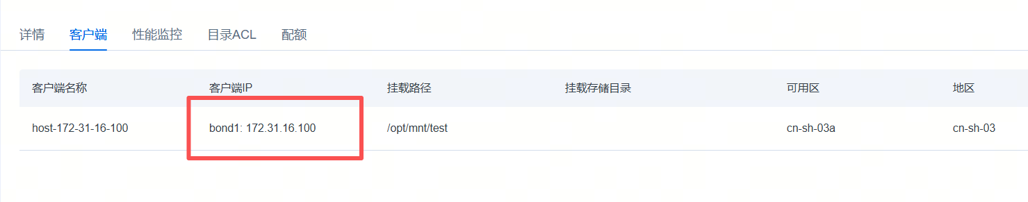 展示计算节点的名称、客户端IP、计算节点挂载路径和挂载存储目录(支持一级目录挂载)、所属可用区及区域信息,其中客户端IP目前只显示裸金属IP。
