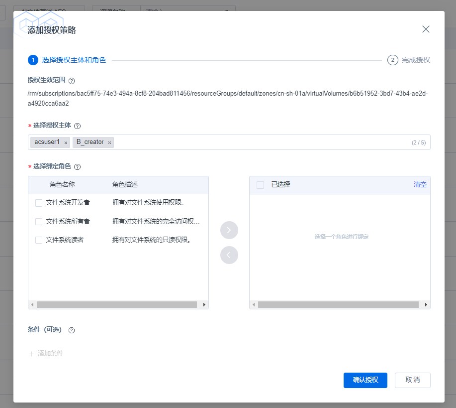 3.在授权策略页面,选择要授权给的用户或者用户组,并选择对应的读写权限,点击确定后生效。