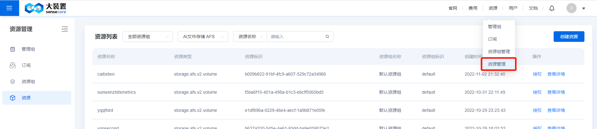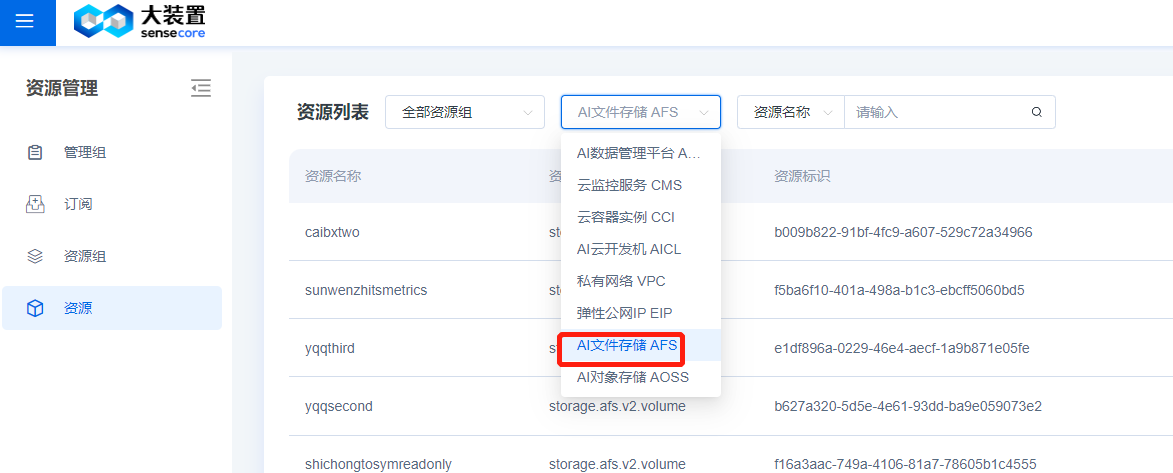 1.在控制台右上方资源下拉按钮选择资源管理并点击,弹出资源列表页,在资源列表选择AI文件存储AFS产品。