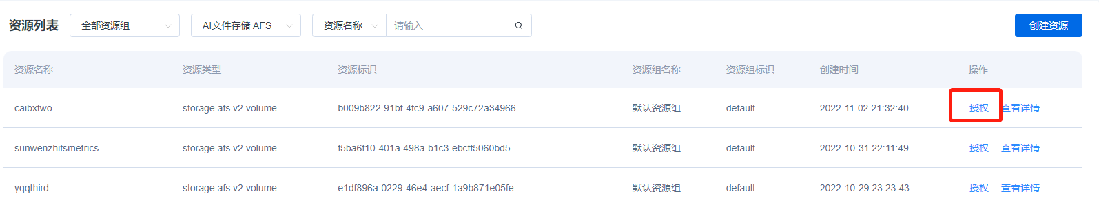 2.资源列表页选择AI文件存储AFS后,资源列表展示已经创建的文件系统实列,找到要授权的文件系统实例,点击对应的授权按钮并点击。
