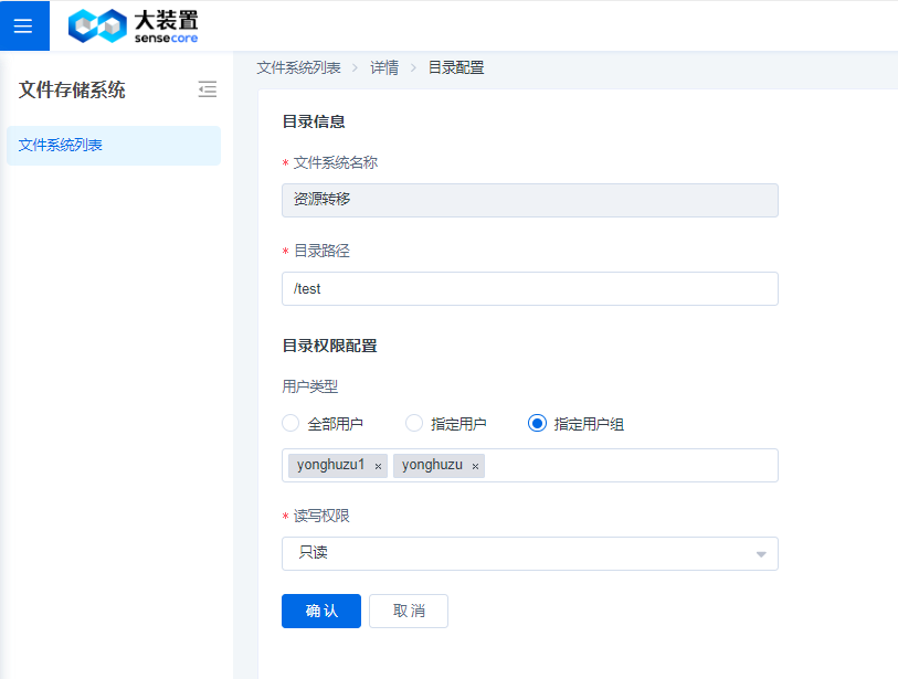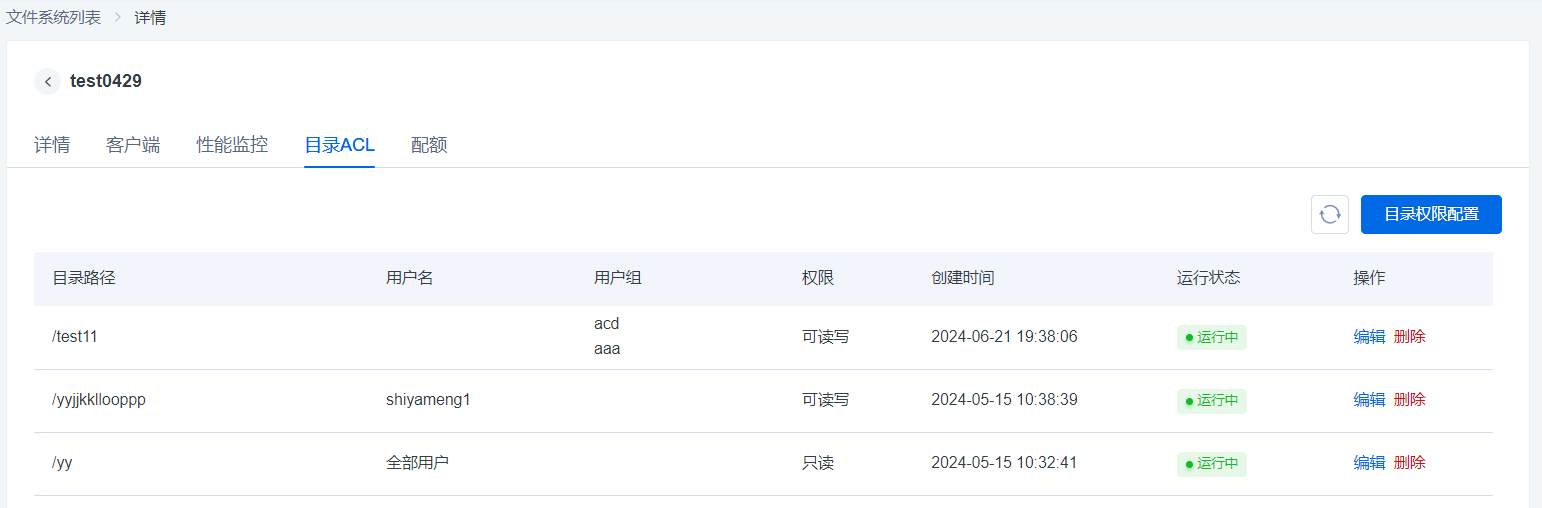 目录ACL页面,支持用户可以配置指定用户或指定用户组对一级目录只读权限或者读写权限的访问。