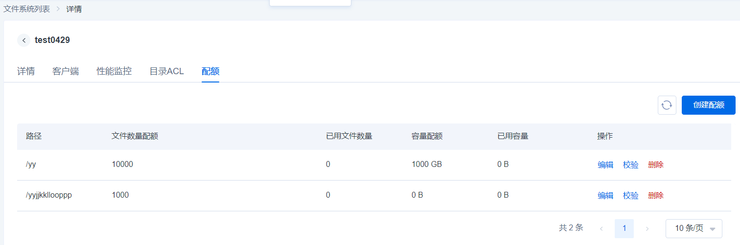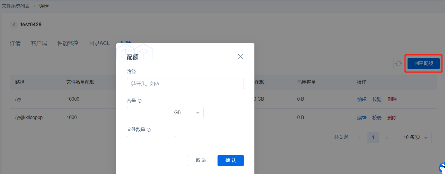点击【创建配额】,可以添加指定一级目录的容量配额或文件数量限制,以实现资源的合理分配和管理。