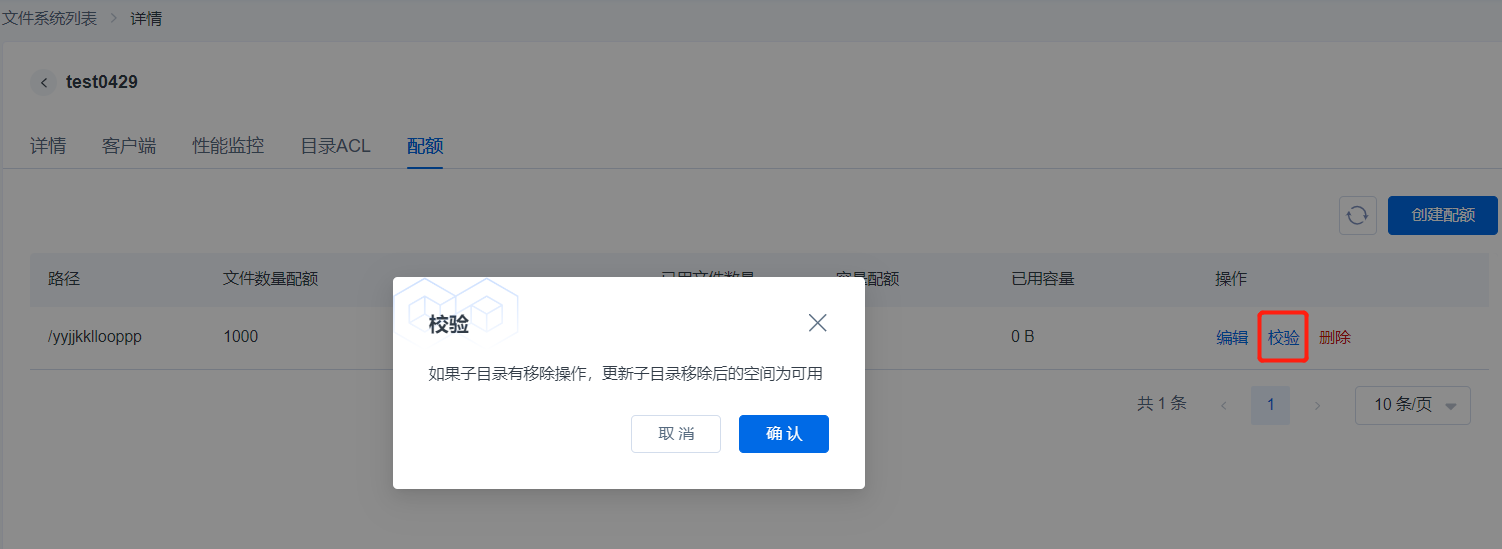 支持手动【校验】,如果子目录有移除操作,点击【确认】后将更新子目录移除后的空间为可用状态。