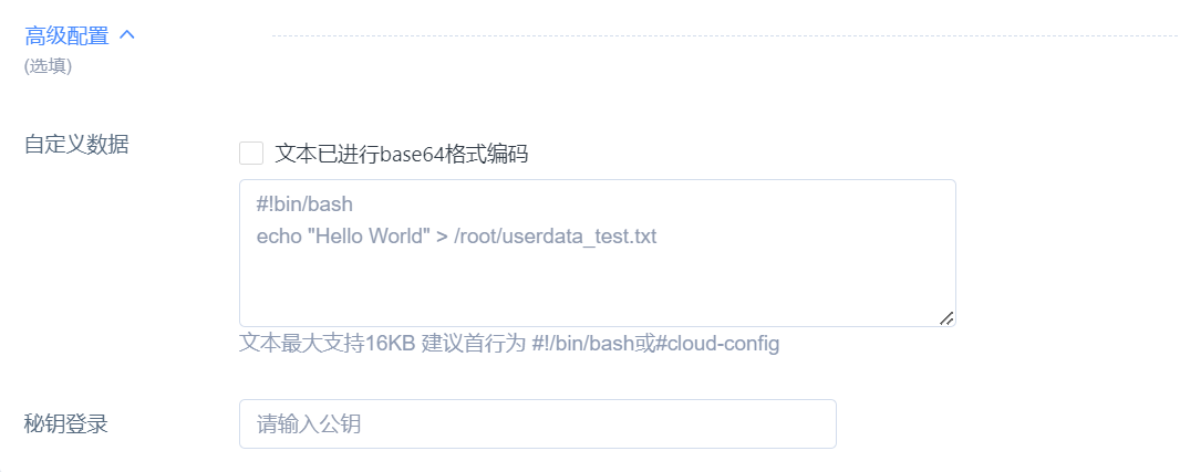 【自定义数据】传入用户user-data;支持如下两种格式(详情可参考User-data formats):