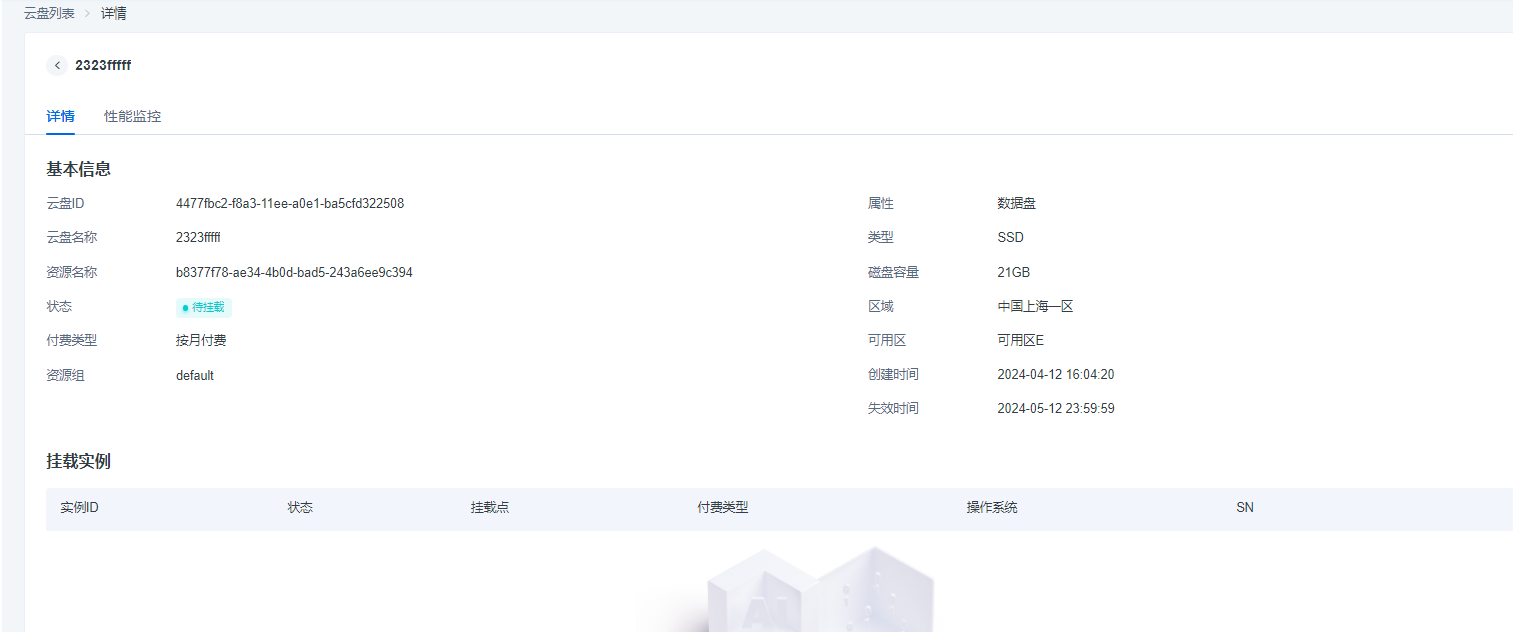云盘详情可以查看当前云盘的资源组、创建时间、以及挂载实例的详细信息。