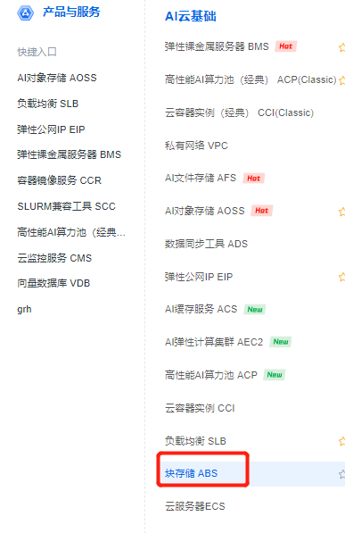 2.在左侧产品导航栏点击 块存储ABS,进入到云盘的控制台。