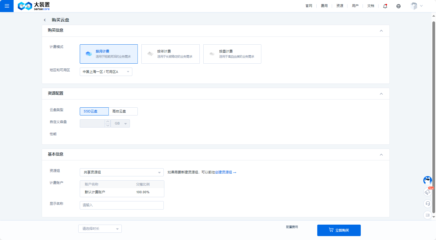 3.点击创建云盘按钮,进入到购买页,选择云盘类型,填写容量(容量范围:20-32768GB)和显示名称(支持中文字符、英文字母、数字及下划线“_",1-63个字符,中英文或数字开头)