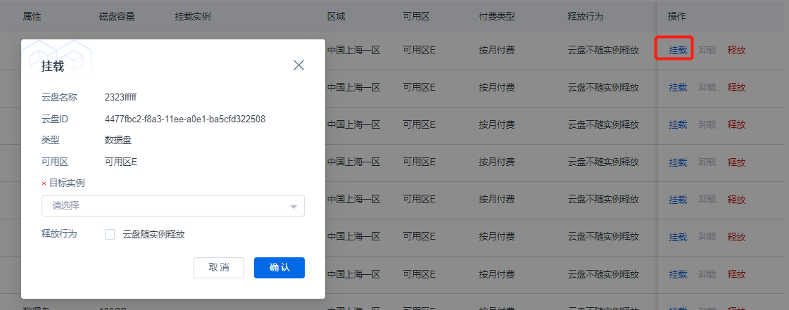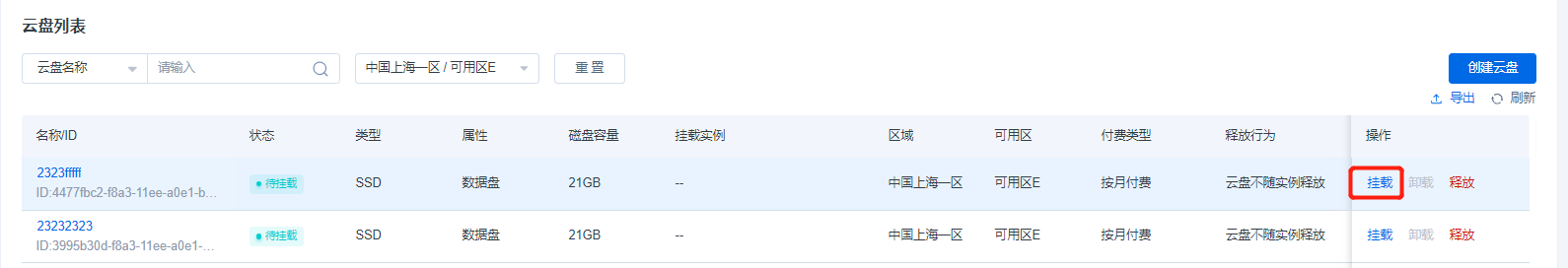 2.在云盘列表页面,选择目标云盘,在操作字段点击 挂载。