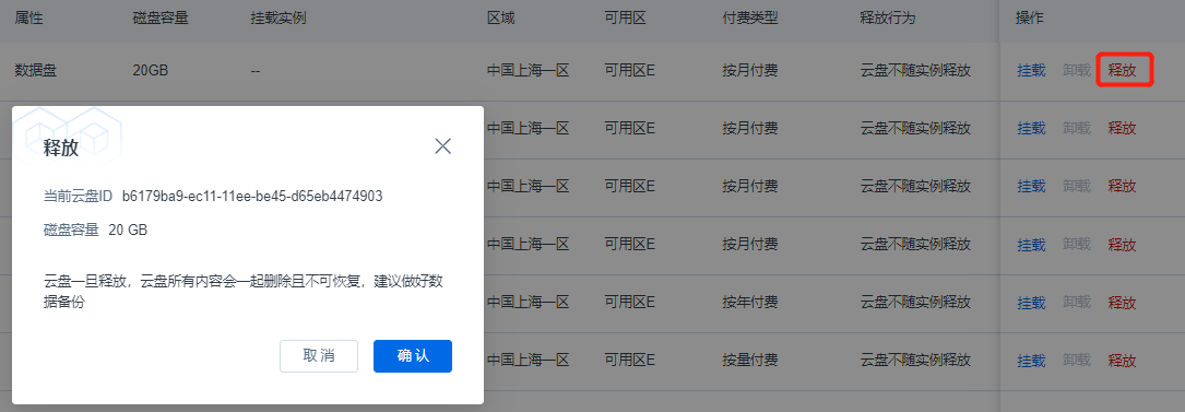 点击【释放】可以将当前未挂载的云盘上的数据全部释放,同时云盘停止计费,该云盘信息从云盘列表中删除